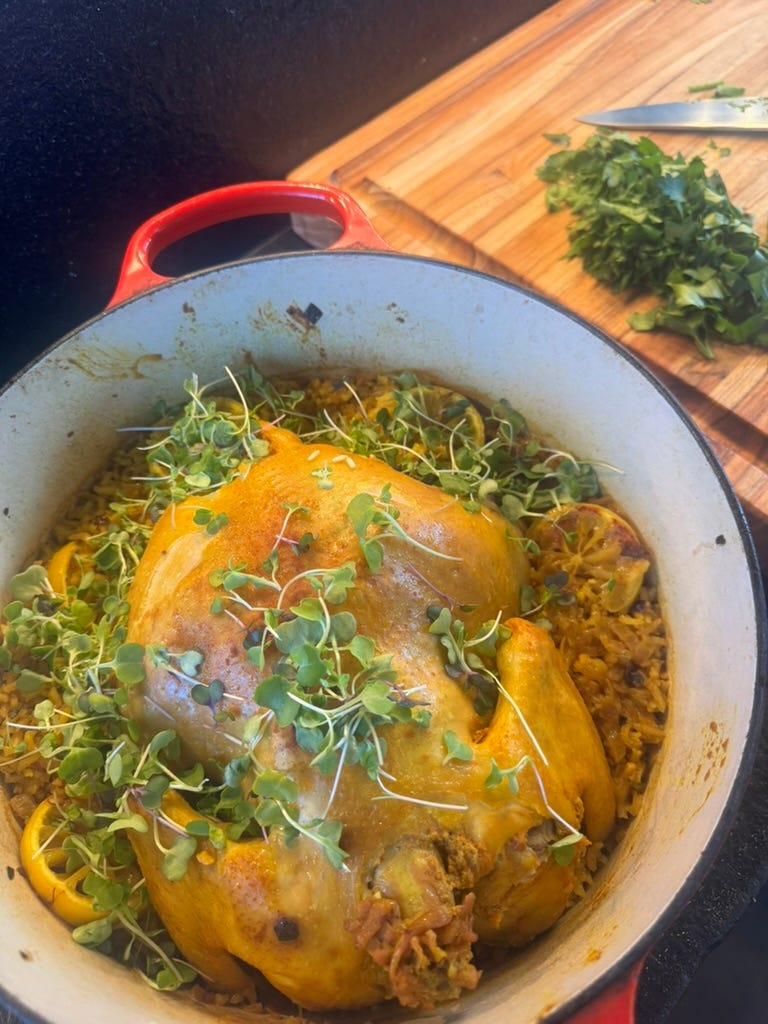 I keep coming back to this meal at the end of long seasons. A whole chicken and rice, cooked together in one pot. It’s simple, steady food, the kind that nourishes without demanding too much in return. Nothing performative.